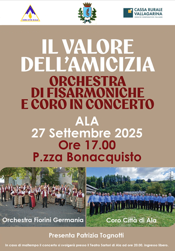 - "Il valore dell'amicizia" Il Coro Città di Ala assieme all'Orchestra Fiorini di Meersburg (Germania) riproporrà, dopo essersi esibiti il giorno prima alla Rocca di Riva del Garda, in P.zza Bonaacquisto ad Ala il "Concerto di fisarmoniche e cori" a sottolineare l'importanza di una amicizia lunga ormai decine di anni grazie anche al loro fondatore Arnaldo Fiorini che con Ala ha sempre avuto un forte legame.
